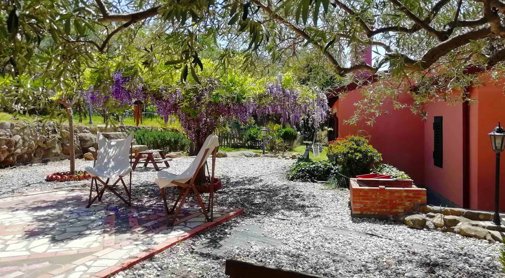 In hun tuin van ca. 1000 m2, hebben ze een groentetuin met tomaten, aubergines, courgettes, paprika’s en fruitbomen van perziken, sinaasappels, peren, kersen, mispel, vijgen, citroenen, waarmee ze hun eigen jam maken. Daarnaast staan er zo’n 15 olijfbomen waarmee ze olijfolie produceren en vele wijnstruiken van de Syrah druif, die ze gebruiken om hun eigen wijn te produceren.