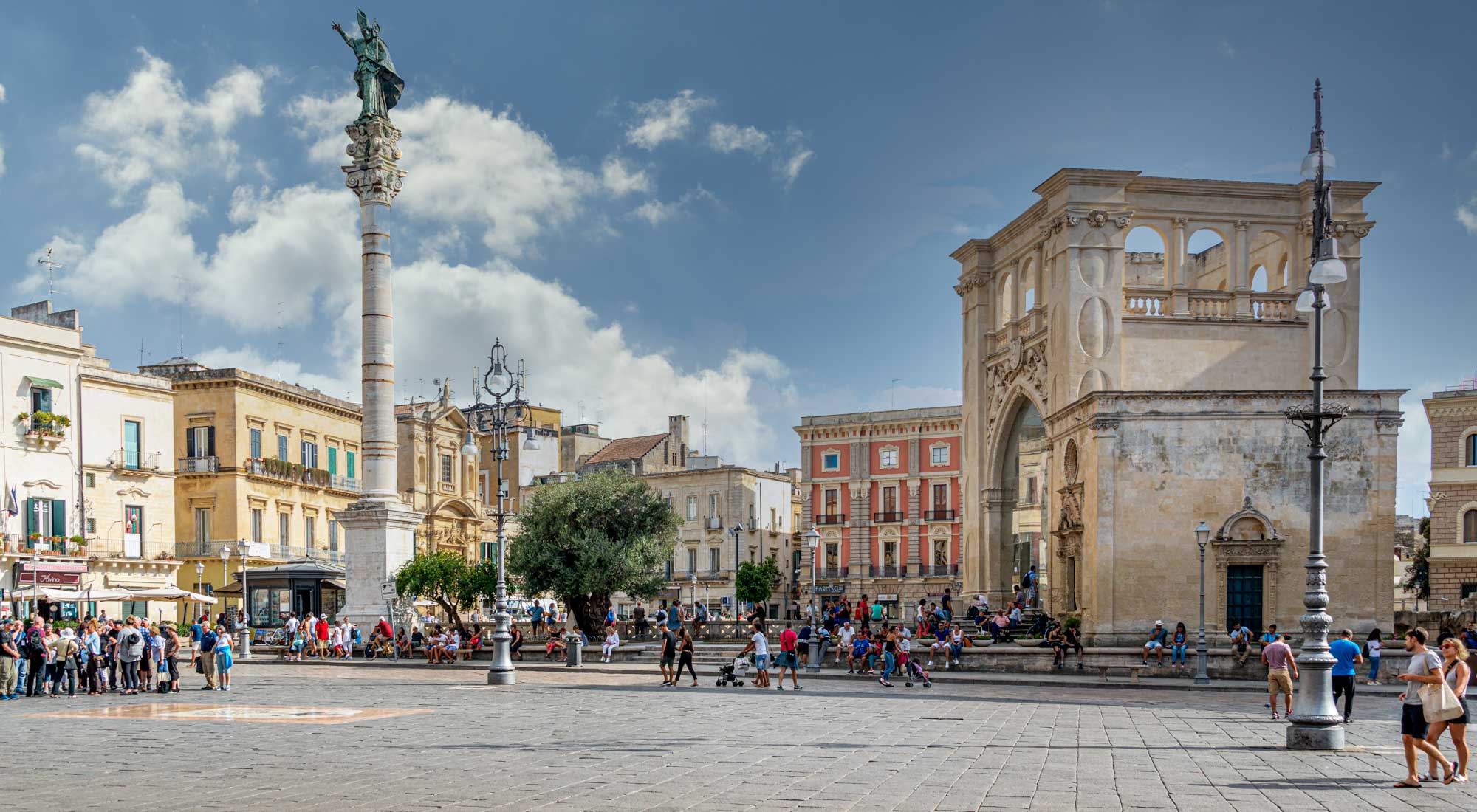 In de hak van de laars ligt Lecce (in de Salento), een prachtige stad met vele zandkleurige monumenten in de barokstijl uit de 16e eeuw en diverse Romeinse overblijfselen. Lecce heeft bijna 100.000 inwoners en is een universiteitsstad. Het gezellige stadscentrum is binnen de muren autovrij en je vindt er kunst, cultuur, talrijke winkels, marmeren straten, prachtige palazzi en barokke kerken, zoals de Santa Croce basiliek. Beroemd zijn hier de papier-maché handwerkproducten (cartapesta genaamd), als symbool van de lokale tradities en geschiedenis. Piazza Sant’Oronzo, het centrale plein van Lecce, bestaat uit het beroemde Romeinse amfitheater en de zuil met de heilige Oronzo, patroonheilige van Lecce.